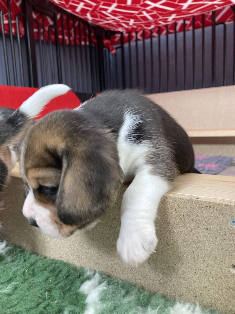 Når hvalpene får mange besøg, møder de en masse forskellige mennesker: mænd og kvinder, unge, ældre og børn. Det er vigtigt for hvalpene, at lære at være trygge ved alle slags mennesker. Samtidigt kan vi lære hinanden at kende, og hjælpe jer med nogle praktiske ting i forbindelse med hvalpekøbet. Det kan være køb af udstyr og valg af træningsplads. Det giver en god start med hvalpen, hvis man anskaffer det rigtige udstyr – dvs. hvalpehalsbånd, line, kurv, skåle, transportkasse m.m. som passer til en beagle og er af god kvalitet. Det er vigtigt at gå til hvalpetræning/hvalpemotivation med sin hvalp, for at den kan lære at omgås andre hunde og mennesker, samt lære nogle basale “øvelser”, såsom sit, gå pænt i snor og komme når man kalder. Lisa er instruktør i DKK Kreds 2 og kører nogle gange hvalpemotivations hold i Gørlev. Vi får lavet hvalpetest på hvalpene, når de er omkring 7 uger gamle. Hver hvalps reaktioner overfor en fremmed person, flokfølelse, lege/jagtlyst, visuel og lyd forskrækkelse m.m. testes. Ud fra resultatet og egne observationer matcher vi hver hvalp i kuldet med en hvalpekøber, således at hver ny ejer/familie får den hvalp i kuldet, som temperamentsmæssigt passer bedst til dem. Selvfølgelig under hensyntagen til købers ønske til køn og farve. Dette har vi rigtigt gode erfaringer med.